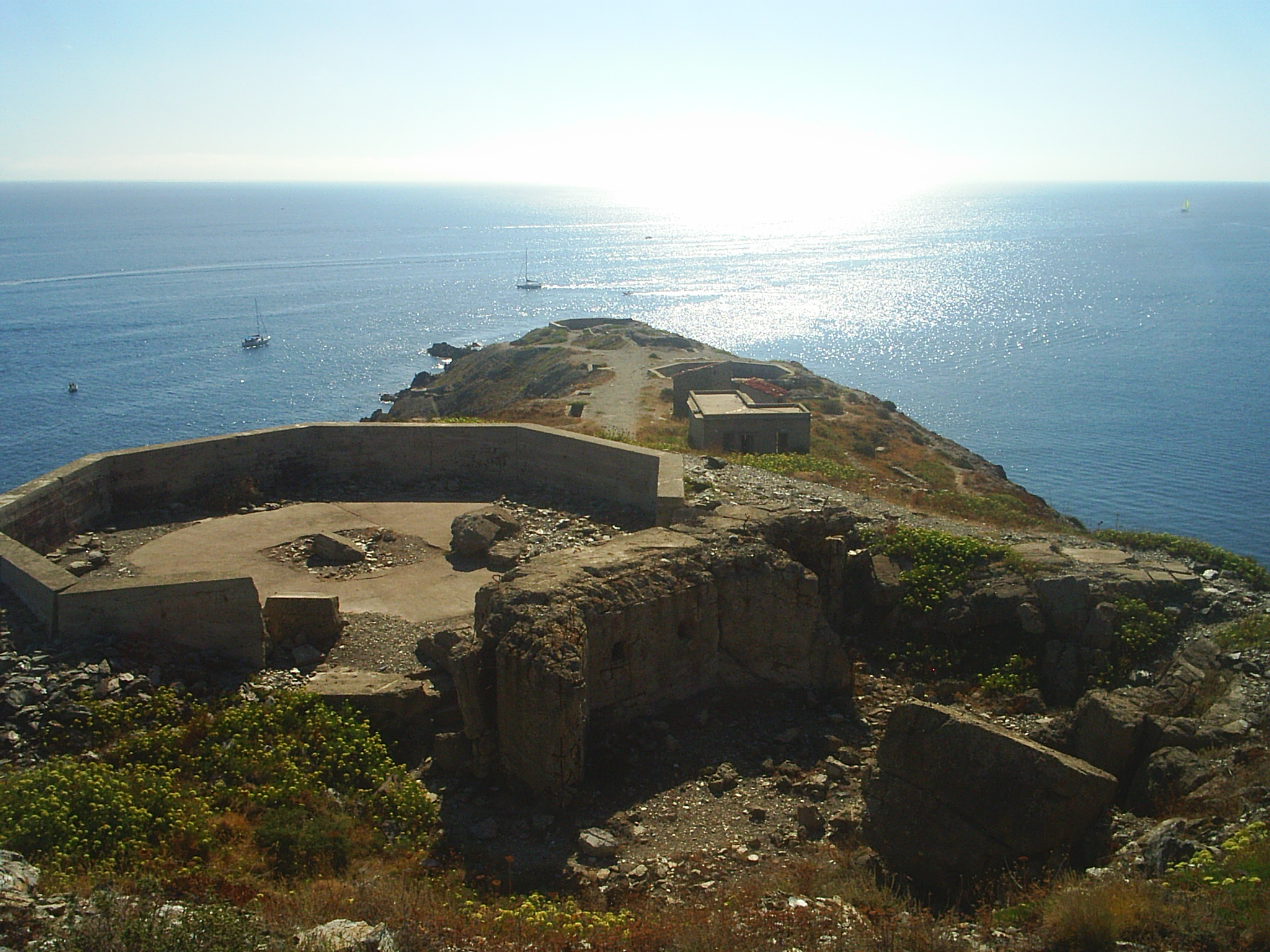 Des d’aquí es pot tornar a l’escala i pujar-la fins al final, punt en que haureu de girar a la vostra esquerra per dirigir-vos a una darrera terrassa artillera de dimensions semblants a la darrera i més propera al mar que hem vist. També si us sentiu més valents, des del niu de metralladora i tot vorejant el penya segat hi arribareu. Si teniu memòria, ben aviat trobareu una diferencia respecte l’últim, certament el tamany de la terrassa es semblant al de la punta però la seva sala contigua es més semblant als tres emplaçaments que hem vist primer. Considerant-ho tal vegada com una darrera sorpresa constructiva d’aquest espai, deixant per desgracia darrera d’una tanca el que sembla un accés a refugi, una estructura quadrada que no puc aventurar que és i un emplaçament de bateria que ara mateix tinc seriosos dubtes que h pugui accedir. Ben cert es que el que hem pogut contemplar fins ara es magnífic i que potser trigueu molt en trobar tal concentració d’estructures i varietat d’elles, per això, i des d’aquestes línies us animo molt enèrgicament a acostar-vos a elles, ben segur en sortireu encantats.