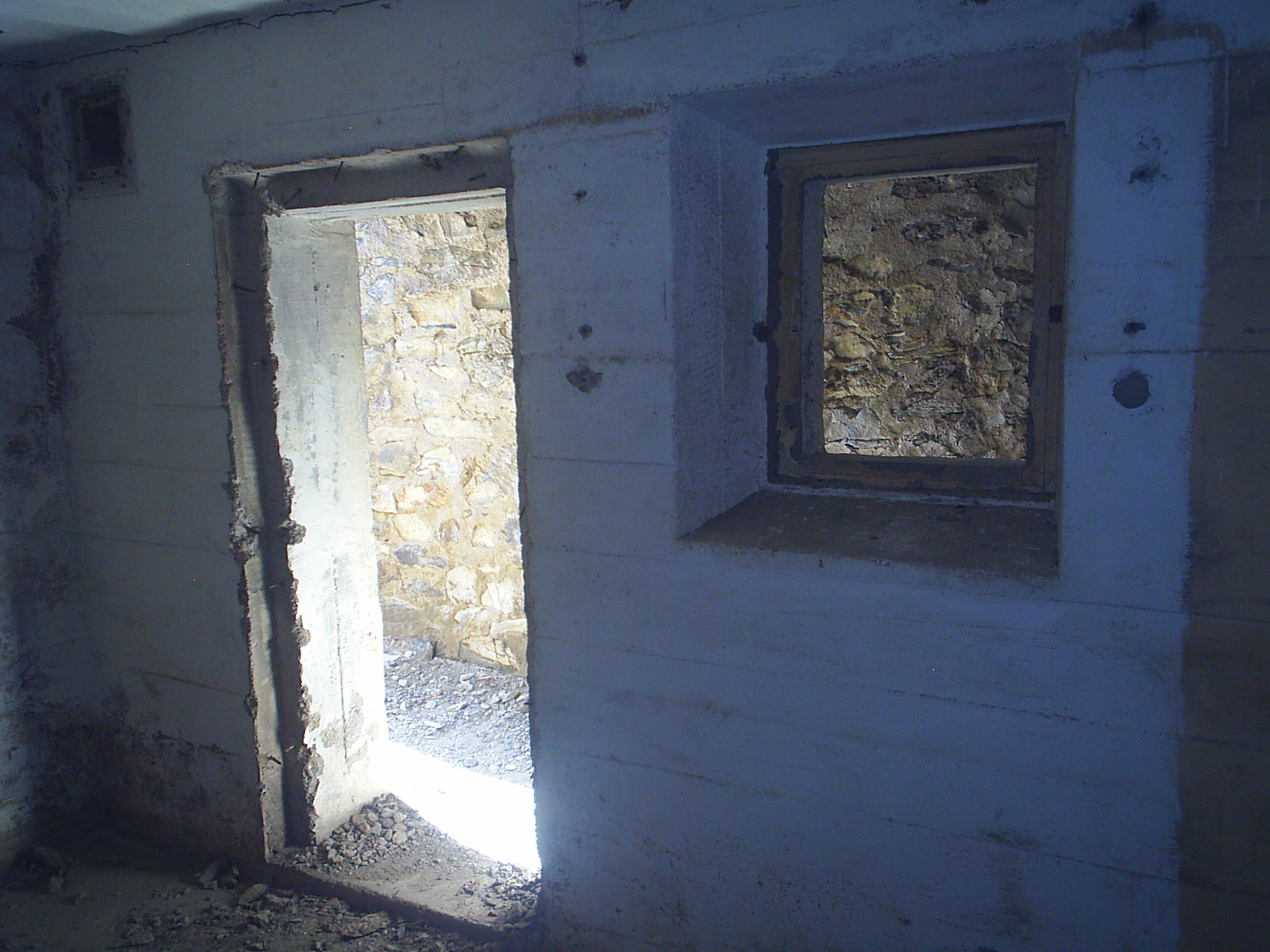 Vista aquesta primera part, ens dirigirem cap baix pel camí principal de les instal•lacions que estem recorrent. Ben aviat arribarem a un bloc de tres edificacions, si bé són tres, crec que dos són posteriors i l’única que dono per contemporània a l’època es una de formigó en forma de L amb un petit porxo. La seva utilitat es difícil, sobresortint del nivell de terra representa un blanc perfecte. I més tenint en compte que a hores d’ara ja us haureu fixat en els múltiples accessos que donen a unes estances subterrànies que recomano que visiteu, veureu que son sales prou grans com per fer qualsevol funció, des d’allotjament de tropa a refugis per si queia alguna pluja d’acer amb males intencions, i el fet que n’hi hagi moltes per tot arreu podria indicar que la dotació de personal per aquestes fortificacions era prou alta.