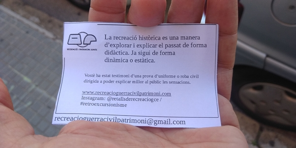 Excursiones vestidos de época Actividad que al final ha cogido el nombre de retroexcursionismo (#retroexcursionisme), en si fue la primera de las que diremos. Se trata de hacer excurisones a zonas patrimoniales y preferentmente concurridas, para que te vean, y ir «armado» con targetas informativas y que dirijan a algun sitio web o redes.
