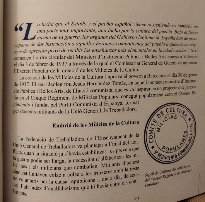 Parlar de milícies de cultura es parlar d’una guerra diferent dins d’una guerra global, es parlar de la lluita contra l’analfabetisme en un món en que una de les lluites es la de la supervivència. I tot això, dut a terme des d’estaments governamentals